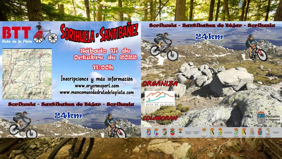 La I Carrera BTT Ruta de la Plata, con un recorrido de 24 kilómetros, se celebrará el próximo sábado, 15 de Octubre. La prueba, que comenzará a las 11.00 horas, partira desde Sorihuela para seguir por Santibáñez de Béjar y finalizar de nuevo en Sorihuela.